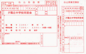 納入には毎年10月に発送しています、同窓会誌「雄飛」に同封の振替用紙(払込料無料)、または郵便局備え付けの用紙をご利用下さい。